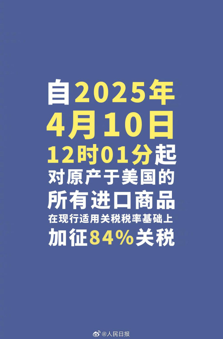 自4月10日12时01分起,对原产于美国的所有进口商品,在现行适用关税税率基础上加征84%关税;